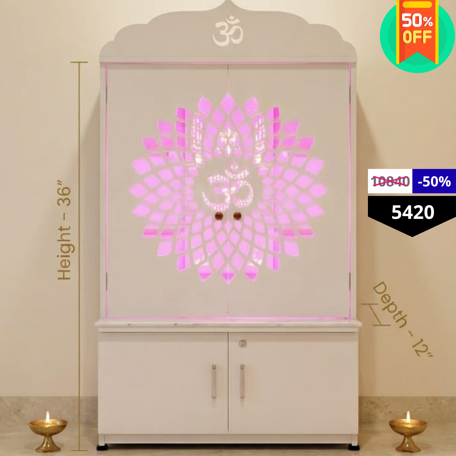 Premium Glass Door LED Pooja Mandir with Lotus Design & Storage