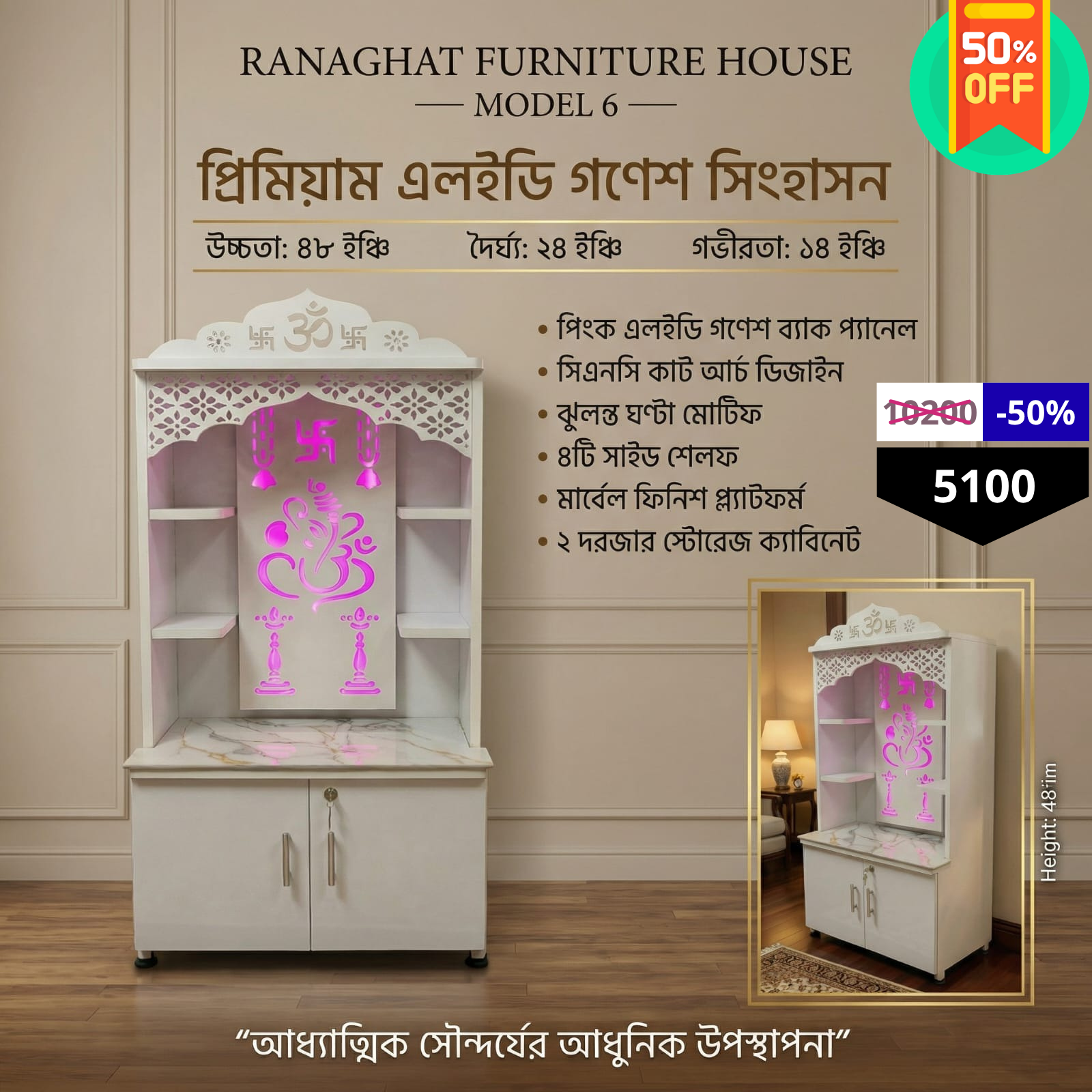 Elevate your home’s spiritual ambiance with this elegant Premium Pooja Mandir (Model 6). Featuring a beautifully crafted LED Ganesh back panel with soft pink lighting, this mandir blends traditional devotion with modern design, making it a perfect centerpiece for your home.