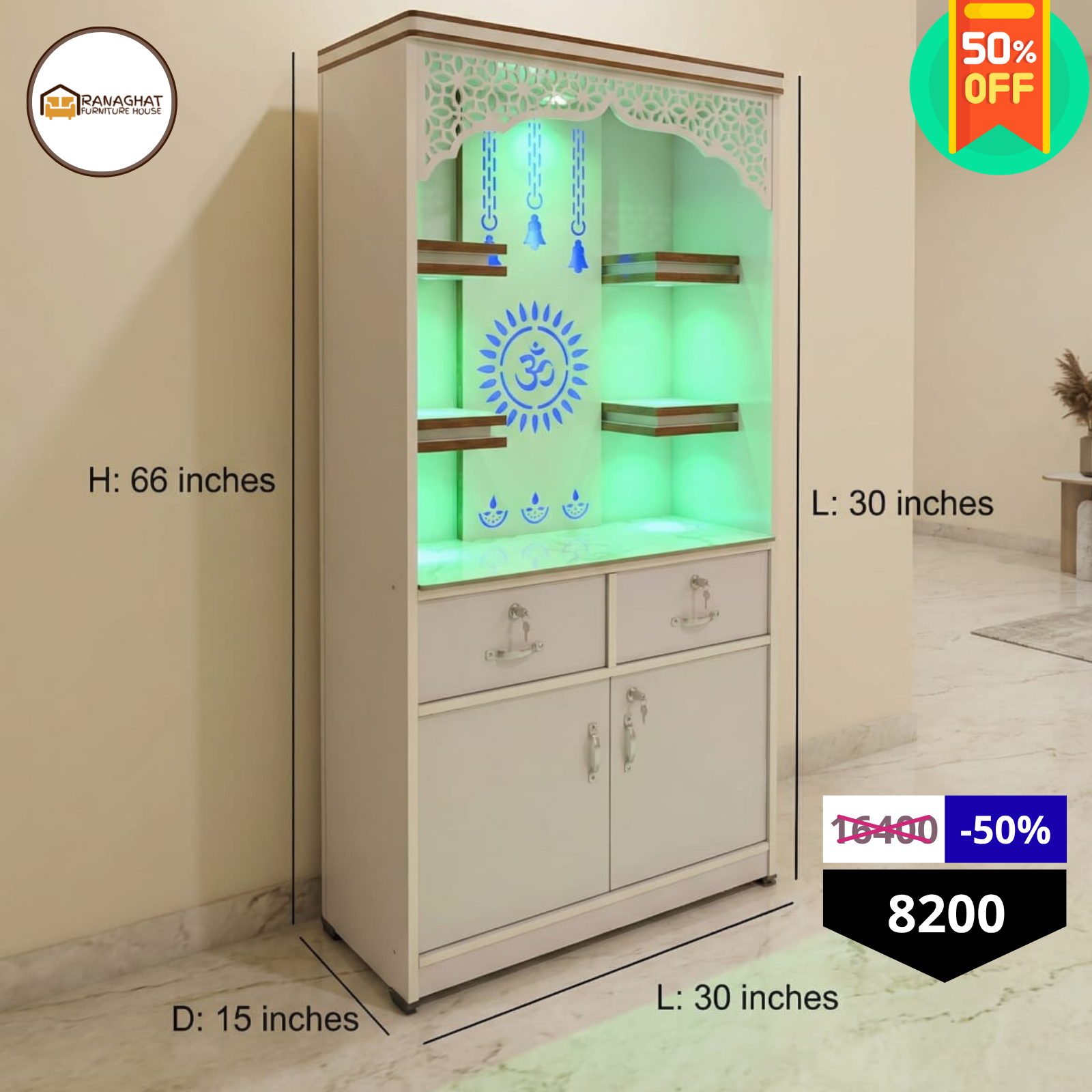 Modern Wooden Pooja Mandir with LED Back Panel & Storage